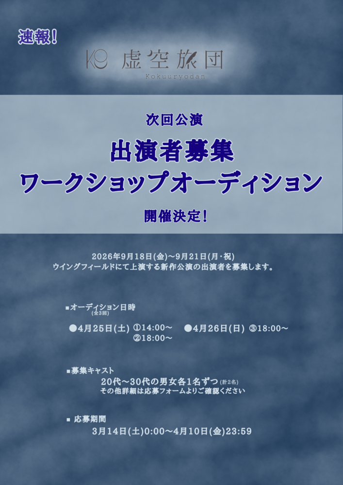 この度、2026年9月公演の出演者ワークショップオーディションを開催いたします。